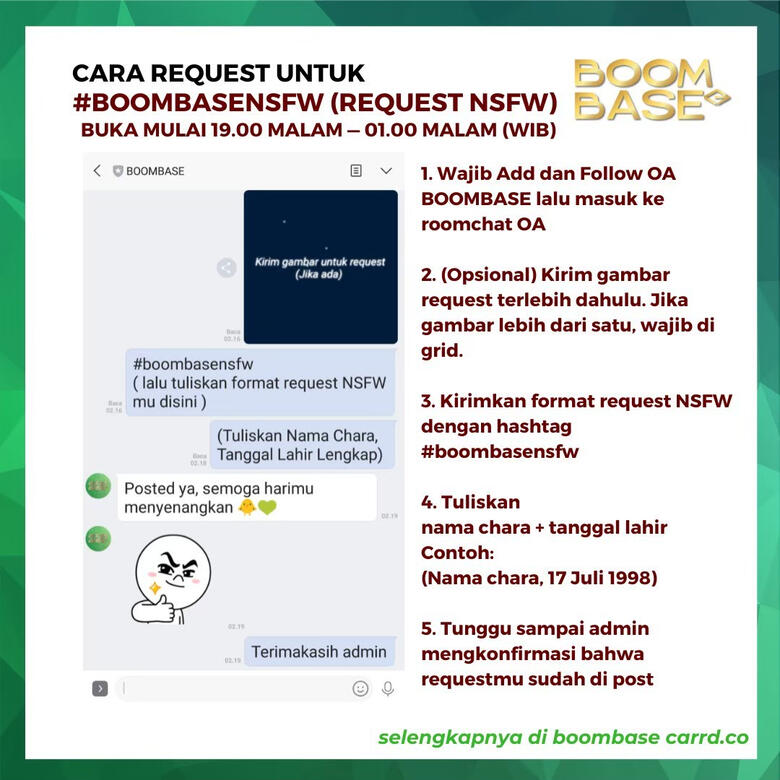 | 4. | Fitur #boombasenfsw dan #boomfess hanya dibuka pada jam 19.00 - 01.00 WIB. Jika request kedua fitur tersebut di luar jam yang ditentukan, maka tidak akan dipost. |