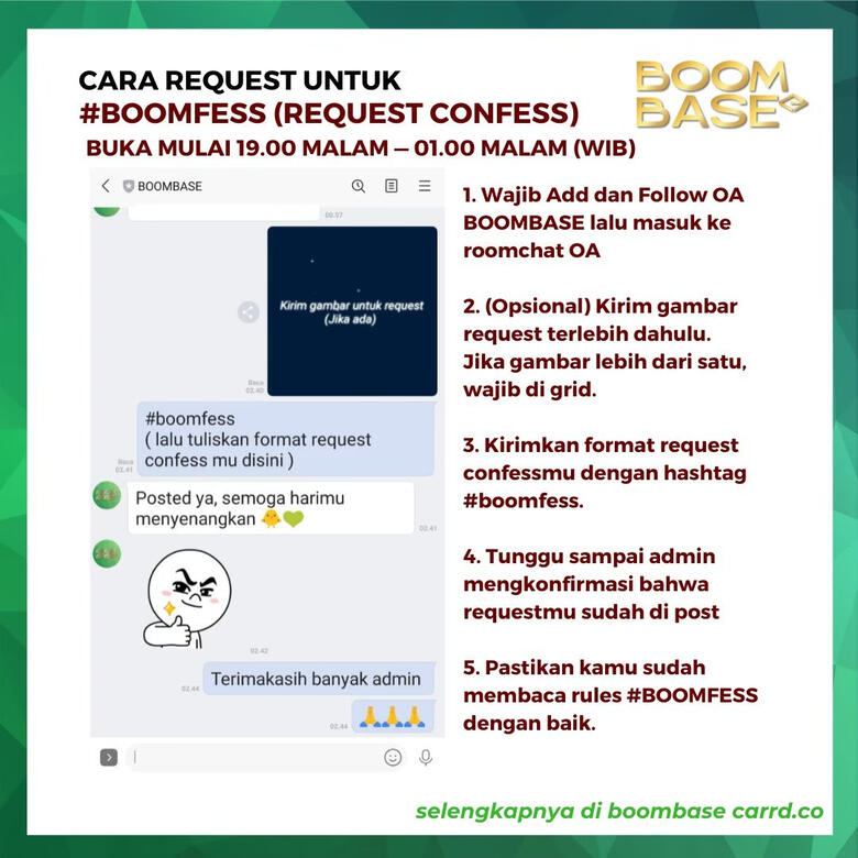 | 4. | Request confess dengan hashtag #BOOMFESS hanya dibuka mulai jam 19.00 - 01.00 malam. Jika mengirim request confess diluar jam tersebut maka tidak akan kami post. |